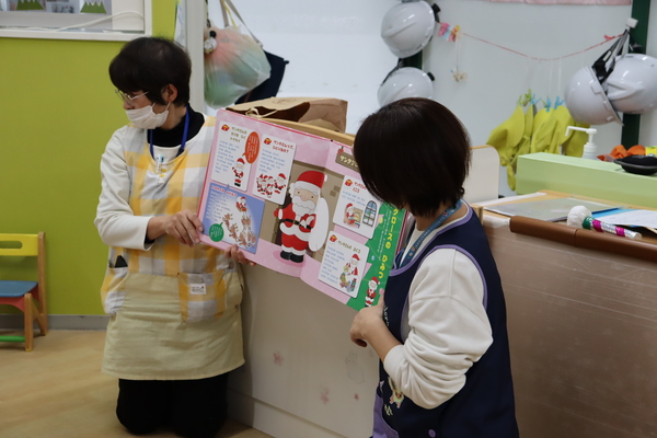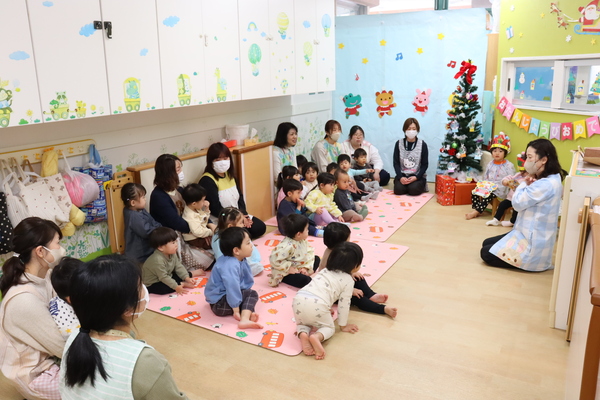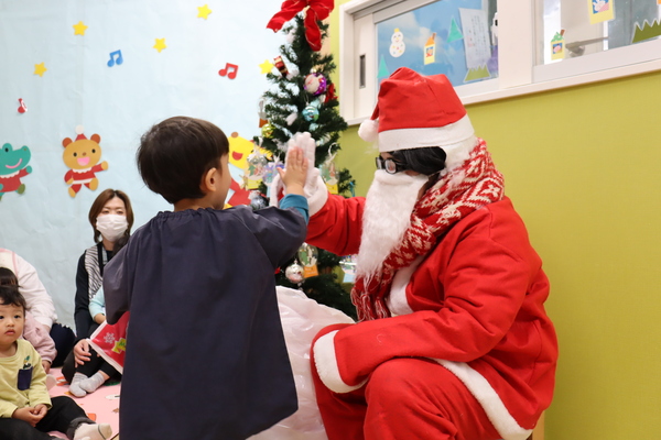 12月のお誕生会を行いました。今月は、11月のお誕生会に出席出来なかったお誕生児のお友だちも一緒にお祝いしました。主役は2名のすみれ組さんだったので、初めてのお誕生会主役にちょっぴり恥ずかしそうにする姿もありましたが、インタビューにお返事で答えてくれる子もいて、とっても可愛らしかったです。誕生会の他にはクリスマスにちなんだクイズやダンスをしました。そして最後には鈴の音とともにサンタさんがやってきて、みんなにプレゼントをくれました♪サンタさんとタッチも出来て、素敵な時間を過ごすことが出来ました♪