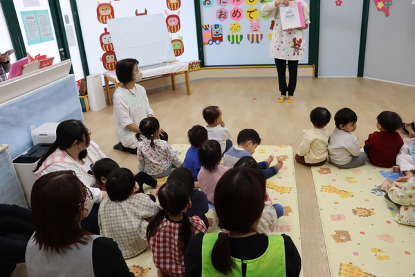 今日は5月のお誕生会でした。第二保育室にはお誕生日のお友だちがいなかったので、北小金保育室のお友だちをみんなでお祝いしました。そして、お祝いの後は先生たちの出し物!今回は「さんぽ」のパネルシアターでした。お歌に合わせて出てくるものにみんな興味津々で見入っていましたよ♪