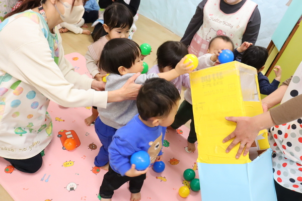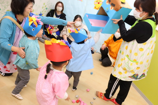 今日は節分集会を行いました。自分で作った鬼のお面をかぶって集会に参加した子どもたち。みんなで鬼のパンツの曲に合わせて踊ったり、豆に見立てた新聞紙のボールを鬼の口に入れる「豆まき玉入れ」をして遊びました。おやつに出た恵方巻のおにぎりも美味しそうに食べていた子どもたちでした〜♪