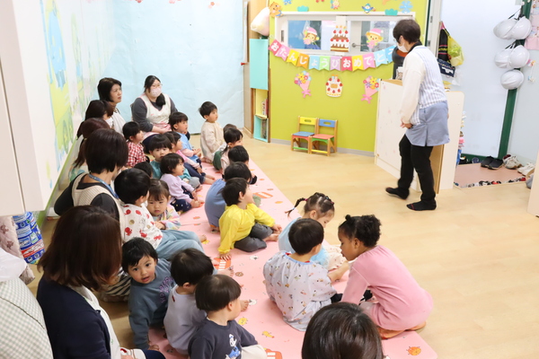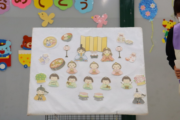 3月3日はひな祭りということで、今日は3月のお誕生会とひな祭り集会を行いました!今年度最後のお誕生会の主役は、2歳児と1歳児クラスから1名ずつお誕生日を迎えるお友だちが参加しました。嬉しい気持ちが溢れていたり、ちょっぴり恥ずかしそうにしていたりと、それぞれの思いが表情に表れていました。先生からの出し物はお雛様についてのパネルシアターと「♪キッチンオーケストラ」という歌に合わせて先生たちが振り付けを披露してくれました♪フライパンやおたまなど、本物の調理器具を見せてもらい、興味津々の子どもたちでした☆