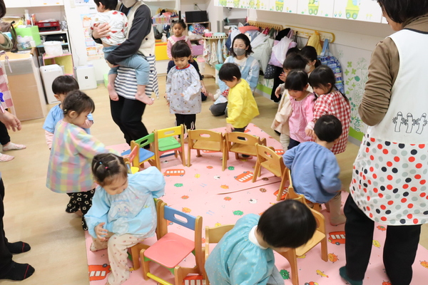 本日修了式とたんぽぽ組のお別れ会を行いました。人形劇やハンドベルの演奏など、先生からの出し物を見たあとに子どもたちからのリクエスト「椅子取りゲーム」をして遊びました♪こうしてみんなで遊べるのも今日で最後と思うと、段々と寂しさがこみ上げますが、明日からはすみれ組さんはたんぽぽ組さんに、たんぽぽ組さんはそれぞれ新しい園へと通い、また子どもたちにとって素敵な日々が始まるのだと思うと、みんなの成長が楽しみになります。今日でお別れにはなりますが、またお顔を見せにきてくださいね♪2年間、たくさんのご理解・ご協力をいただきまして、誠にありがとうございました。